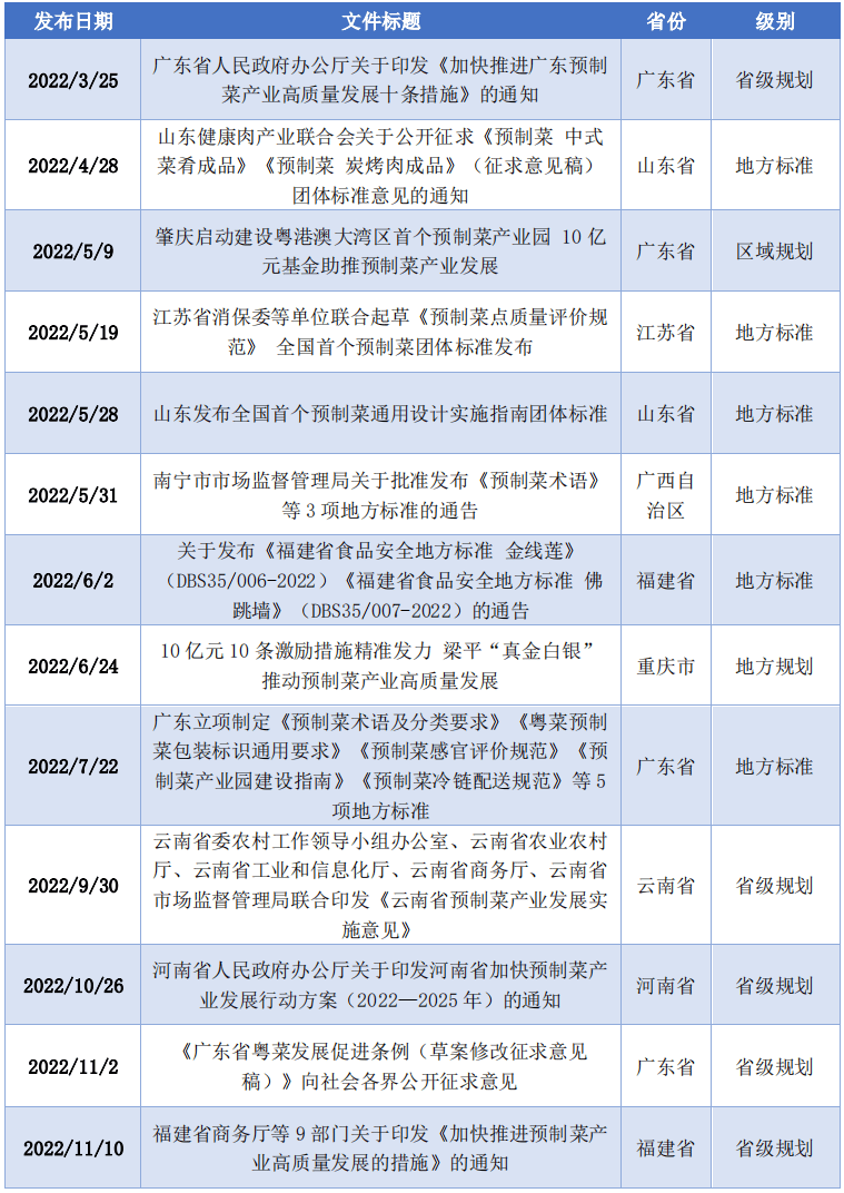 2022年以来,广东、山东、四川、沉庆、福建、浙江、江西、上海、辽宁等多个省市接踵出台预制菜相关财产的政策指点文件,内容次要环绕冷链扶植、企业培育、税收优惠、人才培育、消费补助、品牌打制、财产园扶植和办理等方面。