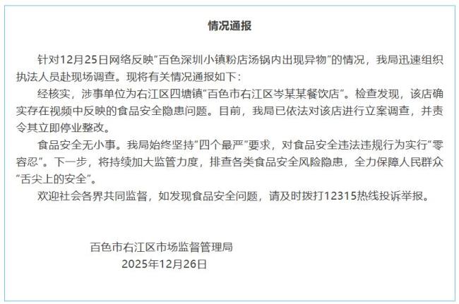 此前,12月25日,广西百色一网平易近发布视频称,正在外吃早餐时从店家锅中捞出一只疑似老鼠的动物尸体。百色市市场监视办理局工做人员暗示已自动监测到该视频并找到涉事店家进行实地核实,初步认定视频内容失实,并对店家进行了立案查询拜访。